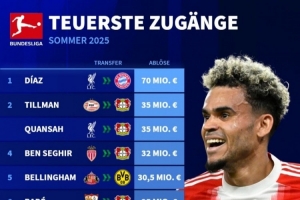 體育資訊9月4日訊 德甲夏窗已經(jīng)截止,《轉(zhuǎn)會市場》也統(tǒng)計了德甲今夏的最貴引援榜,路易斯-迪亞斯斷崖領(lǐng)跑。