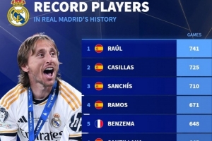 體育資訊7月10日訊 莫德里奇結束皇馬生涯,德國轉會市場列出了皇馬隊史出場榜,勞爾741場居首,莫德里奇597場排名第8位。