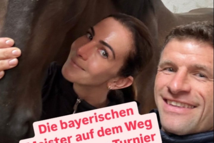 體育資訊07月25日訊 穆勒在社媒上發(fā)布了一張與妻子和馬匹的合照,并配文:巴伐利亞冠軍正在前往下一場(chǎng)比賽的路上。