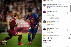賽后拉什福德也在個人社媒曬出本場照片,配文寫道:“身穿巴薩球衣首次賽場亮相,加油????”