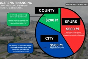 馬刺隊(duì)已承諾為該項(xiàng)目出資5億美元,并保證承擔(dān)任何超支費(fèi)用。其他部分(預(yù)計(jì))為縣場(chǎng)館稅分配1.7億、城市資金5億。