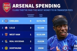阿森納近20年轉(zhuǎn)會費支出最多的俱樂部:歐元