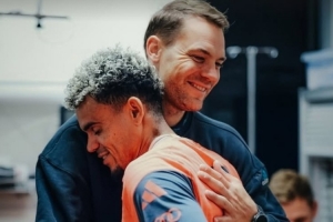 諾伊爾通過社媒曬出自己在拜仁更衣室和新援迪亞斯相擁的照片,并配文:“歡迎@路易斯-迪亞斯?!?/p>
