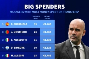 體育資訊7月30日訊 《轉(zhuǎn)會市場》統(tǒng)計(jì)了主教練生涯轉(zhuǎn)會費(fèi)支出榜,瓜帥無懸念居首。