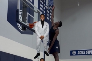 體育資訊7月31日訊 在最近一次楊百翰大學的訓練中,AJ-迪班薩展示了他超強的彈跳。從圖片中可以看到,迪班薩的垂直彈跳直接讓他的頭完全高出籃筐。
