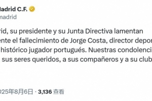 體育資訊8月6日訊 前葡萄牙國腳、波爾圖體育總監(jiān)若熱-科斯塔離世,皇馬官方發(fā)文哀悼。