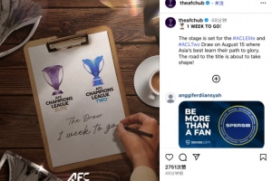 亞足聯(lián)官媒配文寫道:“距離抽簽儀式還有一周!亞冠精英聯(lián)賽和二級聯(lián)賽抽簽將在8月15日舉行,舞臺已經(jīng)準(zhǔn)備好了,通往冠軍之路即將成行!”