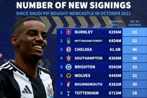 體育資訊7月12日訊 紐卡已經官宣簽下伊蘭加,《轉會市場》也統(tǒng)計了自沙特財團入主紐卡后的英超各隊同期引援人數(shù)情況。