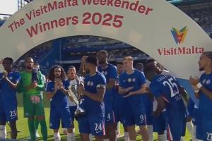 賽后,切爾西隊長詹姆斯代表球隊領(lǐng)取了季前賽獲勝的冠軍獎杯。