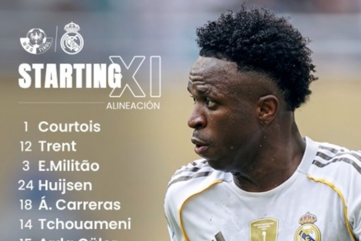 皇馬首發(fā):1-庫爾圖瓦、12-阿諾德、3-米利唐、24-懷森、18-A費(fèi)、14-瓊阿梅尼、15-居勒爾、19-塞巴略斯、21-迪亞斯、10-姆巴佩、7-維尼修斯