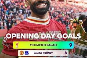 根據(jù)英超官方的數(shù)據(jù)統(tǒng)計,利物浦邊鋒薩拉赫是英超歷史揭幕戰(zhàn)進球最多的球員,達到了9球,在他身后的是魯尼、希勒、瓦爾迪和蘭帕德,他們都打進了8球。