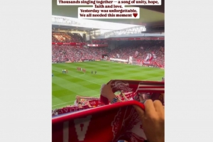 在她的帖子中,娜塔莉亞寫道:“YNWA(你永遠不會獨行)是特別的。永遠如此。這是一句宣言。成千上萬的人一起唱這首歌,一首關于團結、希望、信念和愛的歌。昨天是難忘的一天,我們都需要這一刻?!?/p>