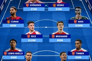 中場:庫尼亞(曼聯(lián))、賴斯(阿森納)、厄德高(阿森納)、薩卡(阿森納)
