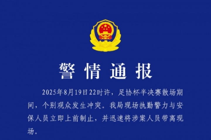 2025年8月19日22時(shí)許,足協(xié)杯半決賽散場(chǎng)期間,個(gè)別觀眾發(fā)生沖突。我局現(xiàn)場(chǎng)執(zhí)勤警力與安保人員立即上前制止,并迅速將涉案人員帶離現(xiàn)場(chǎng)。