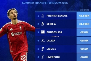 2025夏季轉(zhuǎn)會窗各聯(lián)賽支出支出榜: