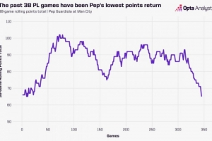 以連續(xù)38場聯(lián)賽的積分而論,這也是曼城自2016年11月以來的最低積分,而彼時瓜帥剛剛執(zhí)教了11場比賽。