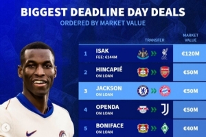 體育資訊9月3日訊 主流聯(lián)賽夏窗已經(jīng)關(guān)窗,《轉(zhuǎn)會(huì)市場(chǎng)》也統(tǒng)計(jì)了夏窗截止日轉(zhuǎn)會(huì)球員的最貴身價(jià)榜情況,伊薩克無(wú)懸念領(lǐng)跑。
