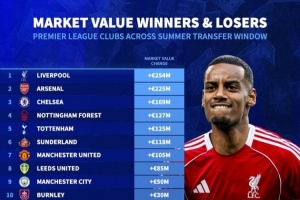 體育資訊9月4日訊 今年夏天,英超各俱樂(lè)部在單個(gè)轉(zhuǎn)會(huì)窗口的轉(zhuǎn)會(huì)費(fèi)支出創(chuàng)下了紀(jì)錄,高達(dá)35.9億歐元。《轉(zhuǎn)會(huì)市場(chǎng)》也統(tǒng)計(jì)了經(jīng)過(guò)今夏(夏季轉(zhuǎn)會(huì)窗口被定義為為6月1日至9月2日,其中包括世俱杯的臨時(shí)轉(zhuǎn)會(huì)窗口)的轉(zhuǎn)會(huì)操作后各隊(duì)的總身價(jià)變化情況,利物浦、阿森納和切爾西分列前三,而桑德蘭的身價(jià)增幅最大、達(dá)到68.4%。