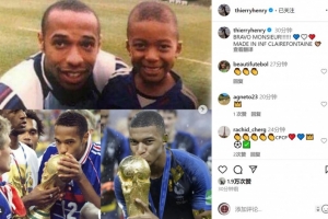 亨利社媒曬出自己與姆巴佩昔日的合照,并配文:“干得好,小伙子!克萊楓丹制造!”