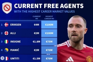 體育資訊9月7日訊 主流聯(lián)賽的夏窗已經(jīng)關閉,《轉(zhuǎn)會市場》統(tǒng)計了當前仍為自由身的球員歷史身價榜,埃里克森和阿里并列居首。