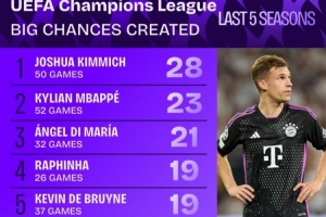 體育資訊9月7日訊 squakwa統(tǒng)計了近5個賽季的歐冠創(chuàng)造重大機會情況,拜仁中場基米希獨自領跑,B費的效率則是前十最高。