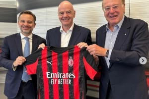體育資訊9月11日訊 不久前,國際足聯(lián)主席因凡蒂諾造訪米蘭總部,并與米蘭高層合影。