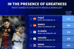 2.拉莫斯,與梅西同場(chǎng)46次,與C羅同場(chǎng)340次,合計(jì)386次