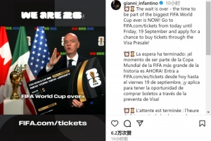 體育資訊9月11日訊 國際足聯(lián)主席因凡蒂諾更新社媒動態(tài),宣布世界杯球票銷售即將開始。