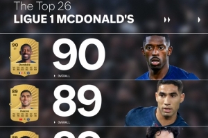 體育資訊9月13日訊 FC26公布了法甲球員評分榜,其中登貝萊居首,具體如下: