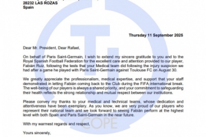信中寫道:“尊敬的主席先生,親愛的拉斐爾:我謹代表巴黎圣日耳曼俱樂部,向您以及西班牙皇家足球協(xié)會致以誠摯的感謝,感謝您們對我俱樂部球員法比安-魯伊斯的細心照料和周到關懷。此前,在我們懷疑法比安在8月30日對陣圖盧茲的比賽中受傷后,貴方醫(yī)療團隊對他進行了檢查?!?/p>