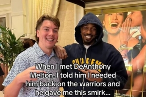 被問到是否回勇士時,梅爾頓只是笑笑沒有回答。之后梅爾頓與兩位球迷合影留念。