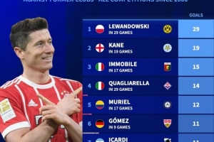 體育資訊9月14日訊 德國轉(zhuǎn)會市場統(tǒng)計了本世紀(jì)五大聯(lián)賽球員對陣?yán)蠔|家的進(jìn)球數(shù)量,并列出榜單,萊萬對陣多特打進(jìn)29球居首,凱恩對陣萊斯特城攻入19球次席。