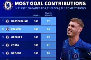 體育資訊9月18日訊 德轉曬出切爾西球員百場參與進球數據,帕爾默100場造74球,排名對視第二。