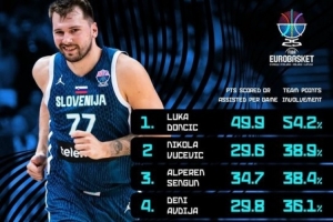 體育資訊9月21日訊 歐錦賽官方發(fā)布了本次賽事得分+助攻得分占全隊總分比重的前十,具體如下: