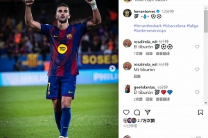 費蘭-托雷斯賽后在社交媒體上曬出照片,慶祝取勝+打進2球,配文:“??+??=????”