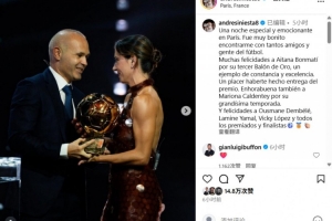 體育資訊9月25日訊 巴薩傳奇伊涅斯塔出席金球典禮為女足金球獎頒獎,今日他更新社媒為所有獲獎?wù)吆吞崦咚蜕献YR。