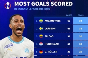 體育資訊9月25日訊 德國轉(zhuǎn)會市場盤點了歐聯(lián)杯球員歷史進球排名,奧巴梅揚34球居首。