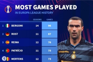體育資訊9月25日訊 德轉統(tǒng)計了歐聯(lián)(含前身歐洲聯(lián)盟杯)球員出場數(shù)據(jù),貝爾戈米96場成為出場王,雷納、曾加位居前十。