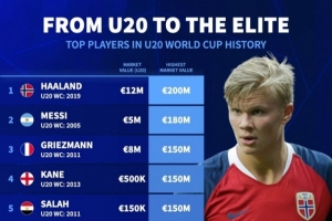 1.哈蘭德(2019年參加U20世界杯):1200萬歐元(參加U20世界杯時(shí)的身價(jià))→2億歐元(生涯迄今最高身價(jià))