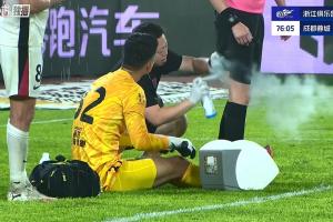 比賽第76分鐘時,劉殿座受傷倒地,隊醫(yī)進場對他進行治療,隨后主裁讓蓉城隊醫(yī)也給自己的大腿后側(cè)噴上噴霧。