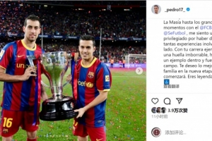 佩德羅社媒曬出與布斯克茨的捧杯合照,寫道:“一位足球巨星宣布退役,感謝布斯克茨為我們奉獻的精彩足球!