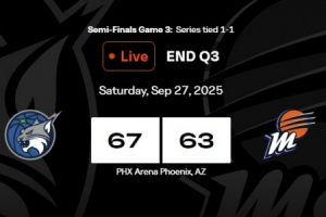 體育資訊9月27日訊 WNBA季后賽半決賽G3(大比分目前1比1),山貓對陣水星。