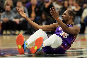格林:“但對(duì)我來(lái)說(shuō)這沒(méi)那么有趣,因?yàn)樗畈欢嗔?。KD都打了19年了,他是個(gè)七尺長(zhǎng)人(注:約2米13)。一個(gè)七尺長(zhǎng)人能打這么久,我覺(jué)得他差不多了,兄弟?!?/p>