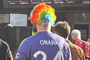 曼聯(lián)本輪英超不敵布倫特福德,記者Samuel Luckhurst曬出一位球迷身穿奧納納球迷的照片,這位球迷還戴了一頂小丑的假發(fā),該記者調侃道:可以肯定的是,這個小伙子不是奧納納的最大球迷。