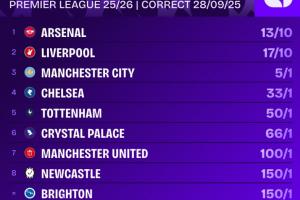體育資訊09月29日訊 本輪英超,阿森納2-1逆轉(zhuǎn)絕殺紐卡斯?fàn)柭?lián),賽后有關(guān)機(jī)構(gòu)更新了英超冠軍的賠率。