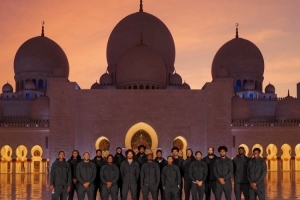 體育資訊10月1日訊 76人官方曬全隊在阿布扎比地標謝赫扎伊德清真寺合照的合照。