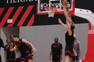 值得一提的是,在昨日的訓(xùn)練中,申京面對(duì)亞當(dāng)斯的防守貢獻(xiàn)了一記暴扣,前者還在社媒曬出暴扣的圖片并@海王,寫(xiě)道:“就是在你頭上扣籃,你這混球!”