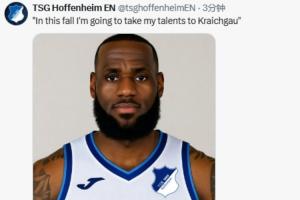 而德甲霍芬海姆也借機在社媒玩了一把梗。他們的英文社媒賬號曬出詹姆斯身穿霍芬海姆球衣的P圖照片,并配文道:“這個秋天,我將把天賦帶到克萊希高(霍芬海姆所在地)?!?/p>