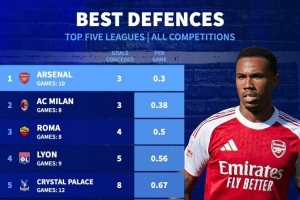 體育資訊10月7日訊 德國轉(zhuǎn)會市場統(tǒng)計了五大聯(lián)賽球隊本賽季的場均丟球數(shù)量,并列出場均丟球最少排名,阿森納0.3球居首,米蘭0.38球次席。