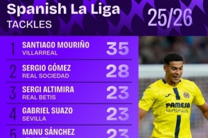 體育資訊10月7日訊 日前,Squawka統(tǒng)計(jì)了本賽季西甲搶斷次數(shù)排行,黃潛后衛(wèi)S-穆里尼奧35次居首。